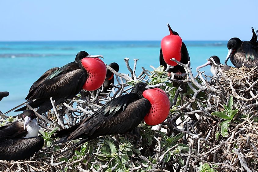 グンカンドリ (Fregata 科、Fregata 属) は、最大対気速度で最も速い海鳥の 1 つにランクされ、機敏で機敏な飛行が可能で、時速 153 km (95 マイル) 以上の速度に達します。特徴的な黒い羽毛、深く二股に分かれた尾、翼を広げると最大 2.3 メートルにもなり、鳥類の中で翼面積と体重の比率が最も高く、空中での驚異的な持久力を可能にします。グンカンドリは日中のほとんどの時間を上空で過ごし、風の流れに乗って難なく飛び、大型の捕食者によって海面に押し上げられた魚やイカを狩ります。また、窃盗寄生性でもあり、飛行中に他の海鳥から獲物を盗むこともよくあります。熱帯および亜熱帯の海洋全域に生息するグンカンドリは、顕著な性的二形性を示します。オスは、交尾の際に印象的な赤い喉の袋を膨らませます。植民地で営巣し、隔年で繁殖し、長期間の親の世話で季節ごとに1個の卵を産みます。