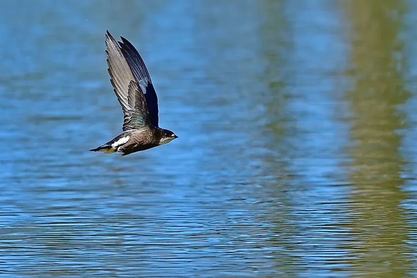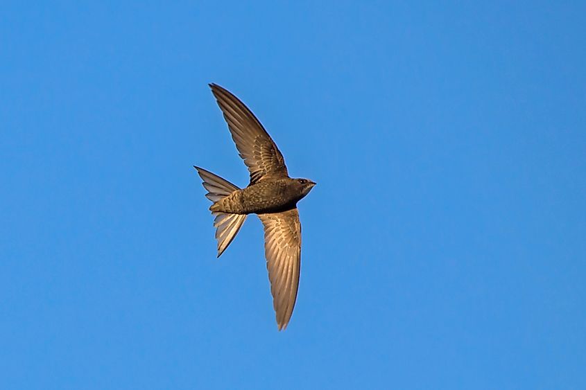 アマツバメ (Apus apus) は、飛行中に時速 111 km (時速 69 マイル) を超える速度に達することができます。外観が似ているためツバメとよく混同されますが、ツバメはアマツバメ目に属し、ハチドリやツバメの仲間です。彼らは垂直にしがみつくのに最適な短い脚を持っており、地面に着地することはほとんどありません。並外れた空中耐久力で知られるアマツバメは、非繁殖期のアマツバメは最大 10 か月間連続して空中で過ごすことができます。体長は 16 ~ 17 cm (6.3 ~ 6.7 インチ)、翼を広げると 38 ~ 40 cm (15 ~ 16 インチ) で、特徴的な後退翼と二股に分かれた尾翼により機敏で高速飛行が可能です。ツバメは声を出して「叫び隊」を形成し、営巣地の近くや上空を一緒に飛び、社会的な交流や航行を促進していると考えられます。