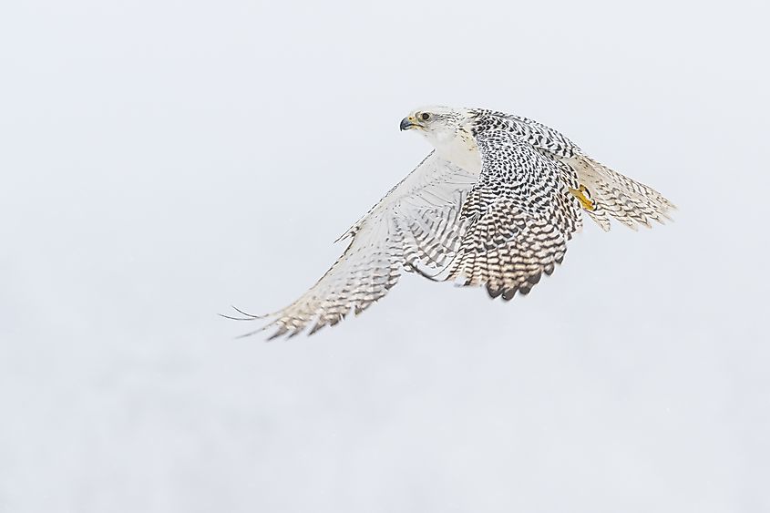 ハヤブサの種の中で最大のシロハヤブサ (Falcorusticolus) は、冬の雪景色の中を飛ぶ猛禽類です。