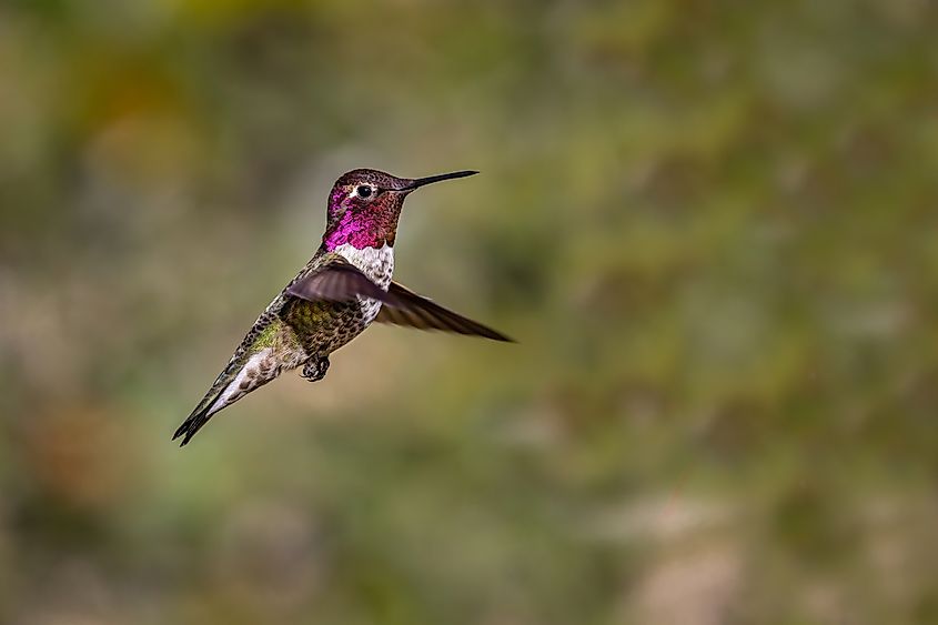 アンナハチドリ (Calypte anna) は、最大水平速度で最速の鳥類にランクされ、最大 96.5 km/h (60 マイル) の持続飛行速度が可能です。北米の西海岸地域に生息するこの小さな鳥は、体長わずか 9.9 ~ 10.9 cm (3.9 ~ 4.3 インチ)、体重 2.8 ~ 5.7 グラム、翼を広げると約 12 cm (4.7 インチ) です。オスは、虹色に輝く深紅の冠と喉のパッチ (ゴルゲット) を示します。これは、特殊な羽の構造により、独特に鮮やかで、角度に依存します。メスは、より鈍い羽毛と小さなゴルゼを示します。もともと渡り鳥であったアンナハチドリは、現在では都市の庭園や人間が提供する蜜の供給者の助けを借りて、一年中北部地域に留まっていることが多いです。彼らの食事には、伸縮可能な舌を介して捕らえられる花の蜜や小さな飛行昆虫が含まれます。この種は、驚くべき空中敏捷性と適応性を示し、人為的に改変された環境で繁栄し、求愛表現や縄張り防衛の一環として高速機動を示します。