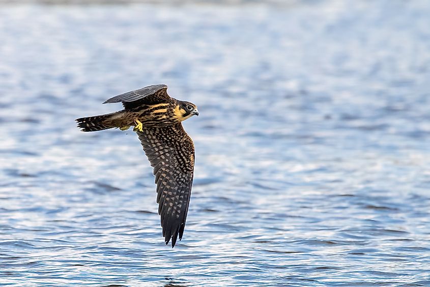 ユーラシアの趣味 (Falco subbuteo) は、その並外れたスピードと空中スキルで有名な小型の機敏なハヤブサです。最高対気速度は 159 km/h (99 マイル) に近づき、迅速かつ正確な操作で獲物を捕らえ、ツバメ、マーティン、トンボ、さらには飛行中にコウモリを捕まえることもよくあります。細身の流線型の形をしており、体長は約29~36cm(11~14インチ)、翼を広げると74~84cm(29~33インチ)です。成体はスレートグレーの上部、暗い冠、黒い顔の縞模様、そして赤毛の太ももが特徴ですが、幼体は茶色の鱗状の羽毛を示します。渡り鳥の個体群はヨーロッパとアジア全域で繁殖し、アフリカと南アジアで越冬しますが、東南アジアの個体群はほとんどが定住します。木々が点在する開けた生息地を好み、放棄されたカラスの巣に巣を作ります。この種はその大胆さと速さで歴史的に鷹狩りで珍重されてきましたが、その驚くべき空中敏捷性は今でも賞賛されています。
