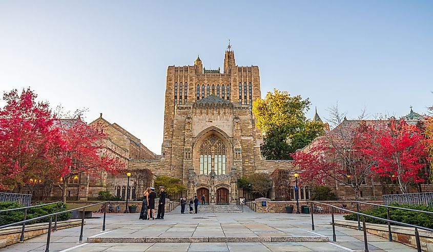 イェール大学のスターリング記念図書館の外の美しい紅葉。編集クレジット: Winston Tan / Shutterstock.com