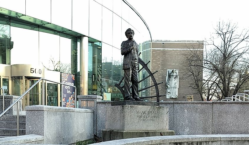 マーク・トウェインの等身大の銅像、ジェームス・E・ブラザーズ作、1994年制作、ハートフォード公共図書館前に設置