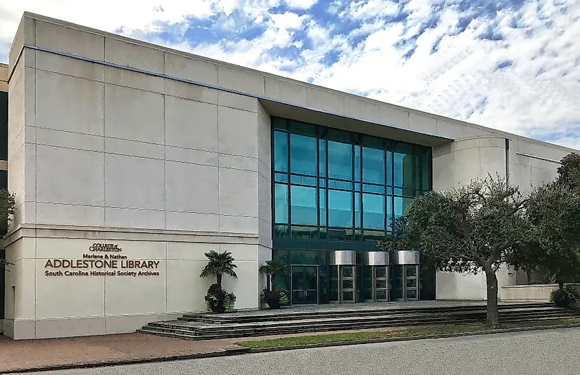 アドルストーン図書館 (マーリーン アドルストーンおよびネイサン アドルストーン図書館としても知られる) は、1770 年に設立されたチャールストン大学の主要図書館であり、サウスカロライナ州で最も古い高等教育機関であり、米国でも最も古い図書館の 1 つです。1 期生 6 名が 1794 年に卒業しました。この図書館は大学で 4 番目の図書館で、2005 年に竣工し、面積は 140,000 平方フィートです。年間 80 万人以上の訪問者を迎え、毎年 200 万以上のリソースにアクセスしています。この図書館には、ローカントリーの歴史と文化に関連する 600 冊以上の写本を含む大学の特別コレクション部門、ユダヤ遺産コレクション、サウスカロライナ州の LGBTQ+ コミュニティの物語を保存する SC LGBTQ+ コレクションが収蔵されています。また、アンティーク ラジオ、電話、蓄音機、その他の録音および放送機器を含む、元のジョン リバース通信博物館からの多くの品目の新しい本拠地となります。