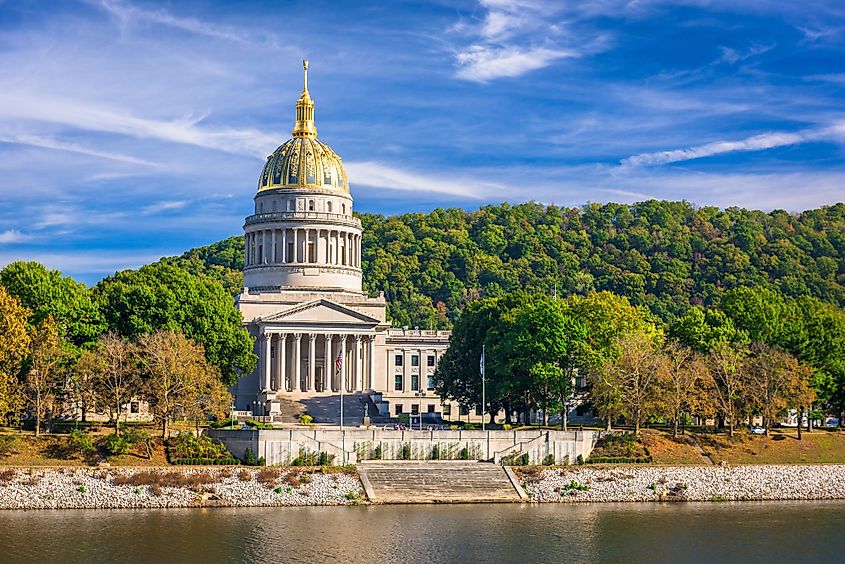 ウェストバージニア州チャールストンのカナワ川沿いにあるウェストバージニア州議会議事堂。