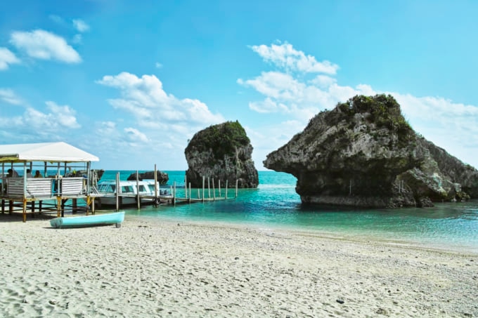 沖縄のメインアイランド近くのヤガジ島のすぐ北に、世界で最も長い海の交差点の1つを車ですぐに車で行くとコウリ島に行きます。日本で最も美しい海の景色を眺めることができると噂されているコウリ島は、そこで繁栄する豊かな種類の海洋生物で有名です。島の砂浜のすべての海岸の中で、コウリビーチは最も美しく、浅くて暖かく魅力的な水があり、水泳に最適です。トケイビーチはシュノーケリングに最適ですが、ティヌビーチは象徴的なハート型の岩の人気の観光地ですが、小型と厄介なクラゲの厄介な人口のために水泳には理想的ではありません。