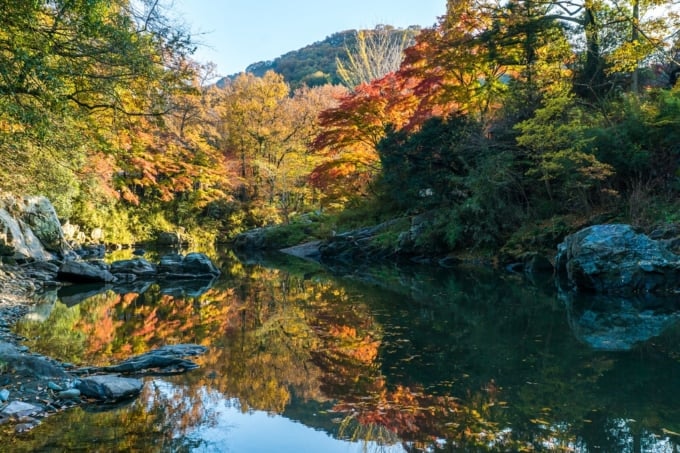 嵐山渓谷は、名前の漢字が「嵐山」と同じであることだけでなく、京都の有名な竹林に似ていることから「武蔵の嵐山」とも呼ばれています。ただし、嵐山渓谷には竹ではなく背の高いカエデ、スギ、マツの木立が生い茂っており、秋のハイキングに人気の場所です。