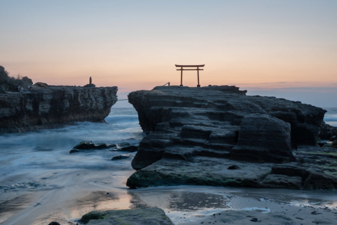 伊豆半島最古の神社である白浜神社は、その起源が2400年前に遡ると言われています。寺院自体も美しく、歴史に包まれていますが、最も人気があるのは、この地域で最も美しいビーチの 1 つの隣、海岸の岩の上にある鳥居です。下田から車で10分ほどの白浜は、東向きの場所にあるため、初日の出の名所として人気があります。