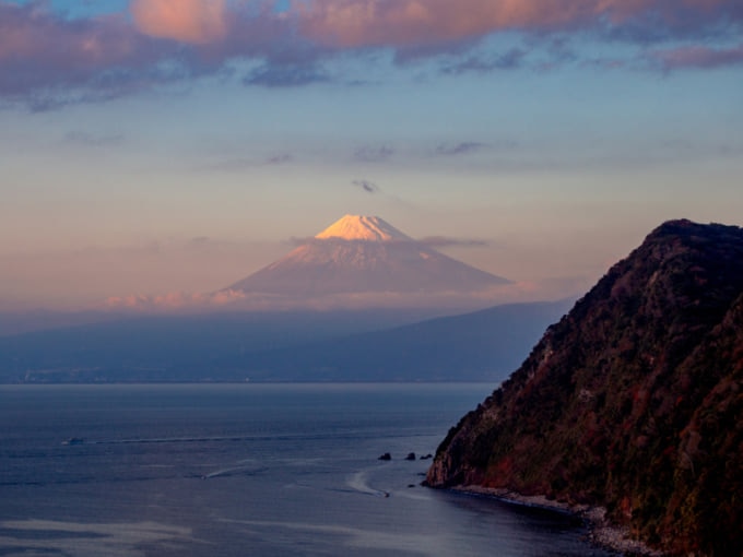 象徴的な山頂の影に半島があるため、天気がよければ、伊豆西海岸から富士山を眺めることができる可能性が高くなります。大瀬岬など沼津の海岸沿いのポイントに行くと、沼津の山をはっきりと眺めることができます。黄金崎公園や恋人岬など、さらに海岸沿いの他の場所からもよく見ることができます。