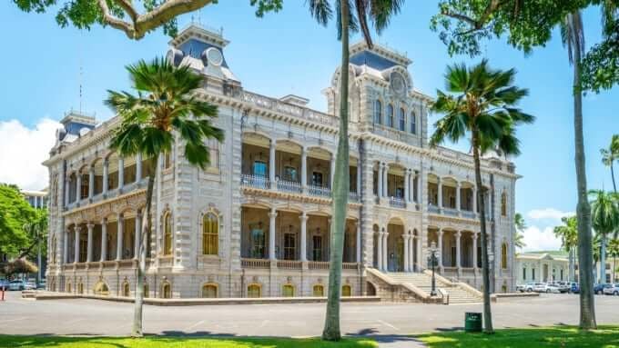 イオラニ宮殿はアメリカ唯一の王宮です。 1882 年にカラカウア王によって建てられたこの宮殿は、建設費 36 万ドルをかけて当時最も先進的な宮殿の 1 つでした。実はイギリスのバッキンガム宮殿よりも前から電気照明が設置されており、豪華なデザインを誇っていました。