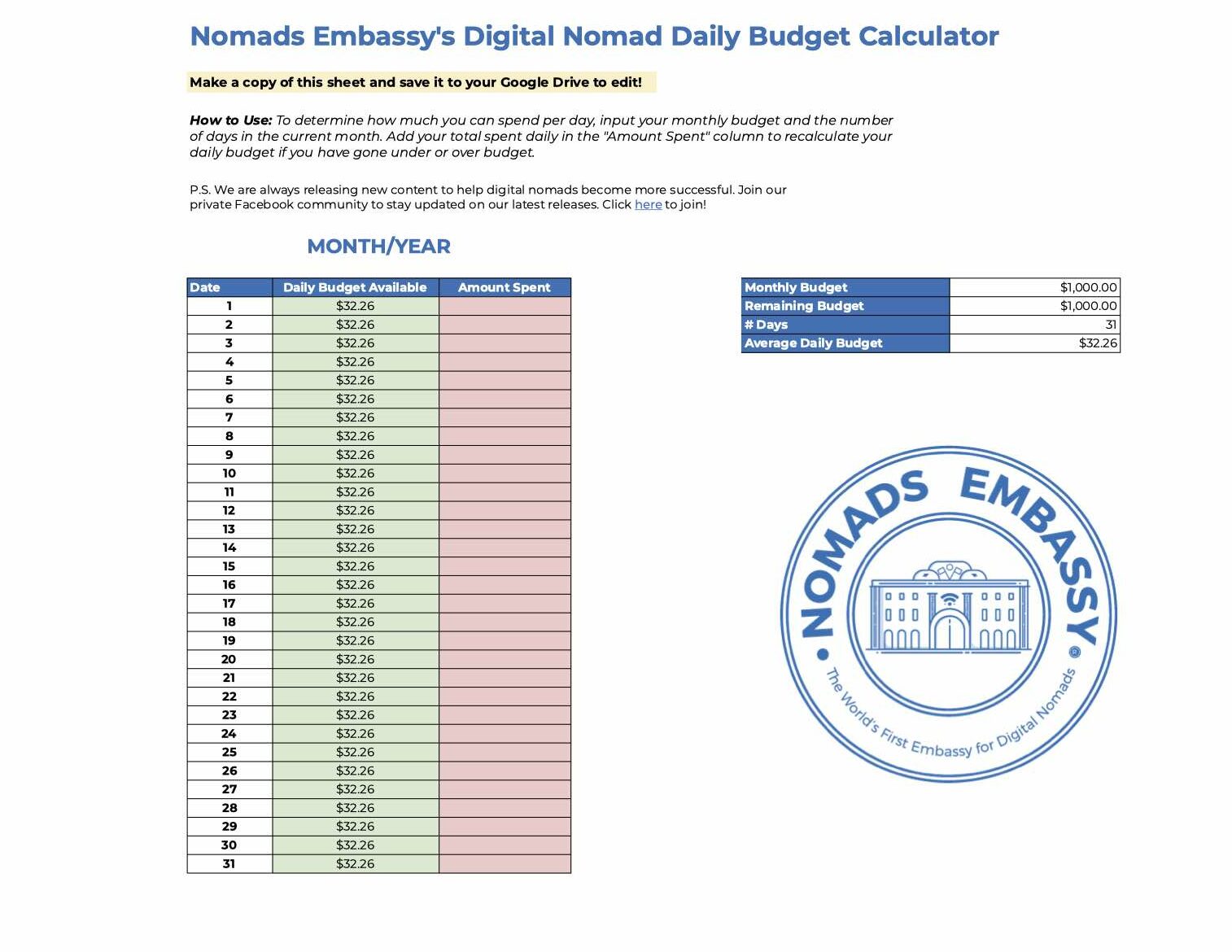 NomadsNews のデジタル ノマド予算スプレッドシートを使用すると、支出を追跡し、予算内に収めるために毎日いくら費やすべきかを正確に知ることができます。
