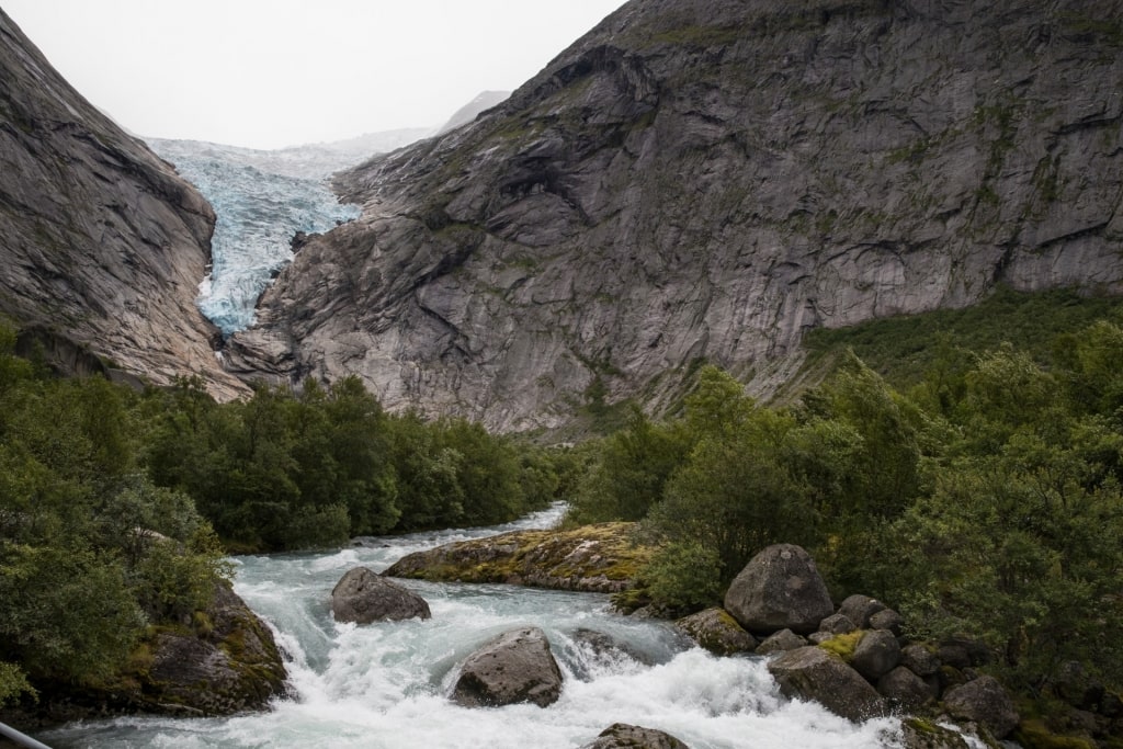勇敢な旅行者は、松林の森を通る中程度のレベルのハイキングと滝によって到達したJostedalsbreenの腕であるIce-Blue Briksdal Glacierに挑戦できます。