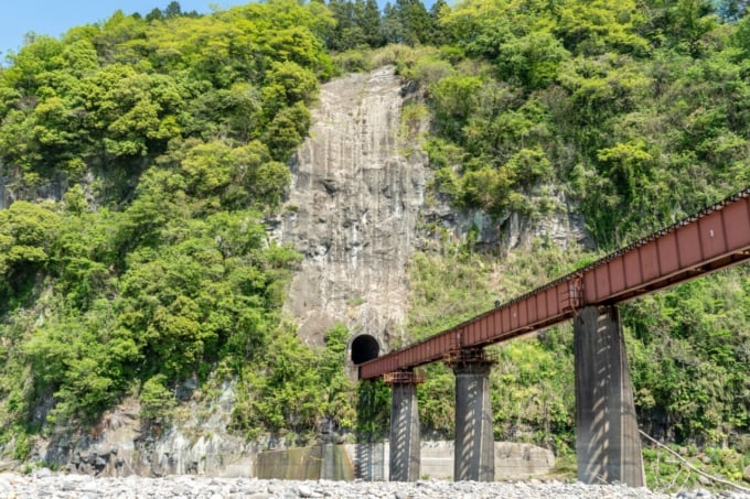 このトンネルは、90、000年前にアソ山の大規模な噴火から吸い取られた火山灰の固化した火山灰の岩壁に掘られました。大きな崖の下では、約1億年前の大西川の層序の露出した層を見ることができます。