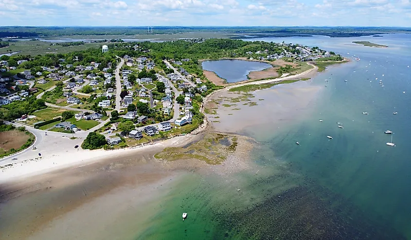 マサチューセッツ州イプスウィッチの町にあるイプスウィッチ湾のグレート ネックとパビリオン ビーチの空撮。画像クレジット:Wangkun Jia、Shutterstock経由