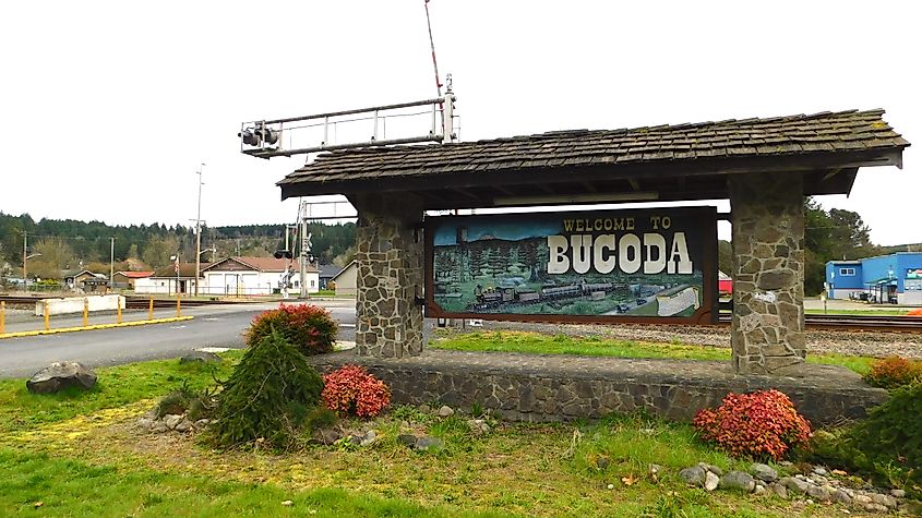 ワシントン州ブコダの入り口にあるブコダサインへようこそ。画像クレジット:Wikimedia Commons経由のOlympiabuebird。