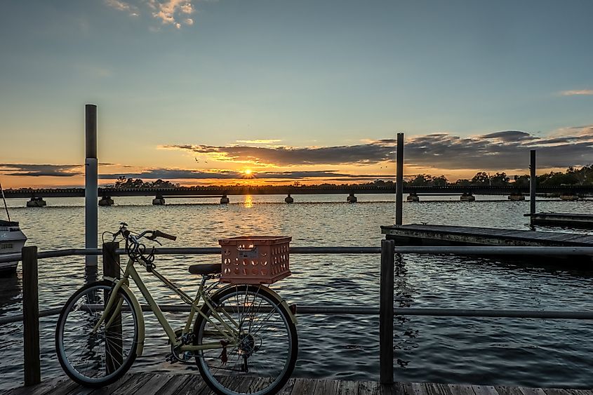 サウスカロライナ州ビューフォートのダウンタウンの歴史地区、ベイ ストリートの南に位置するヘンリー C. チェンバース ウォーターフロント パークの遊歩道。