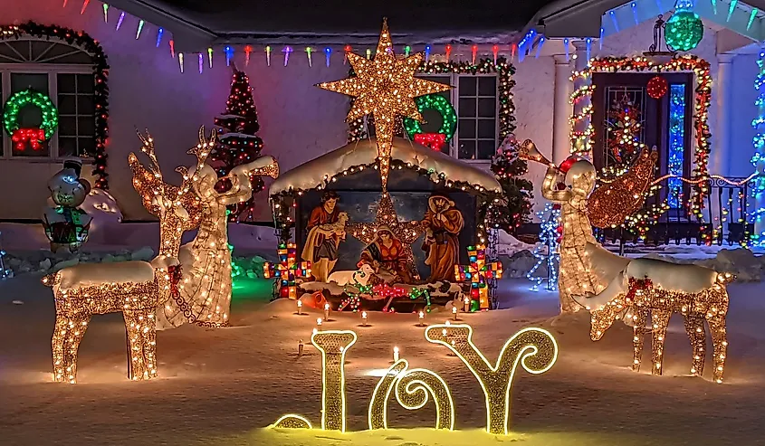 マサチューセッツ州ストーンハムのクリスマスのキリスト降誕のライトアップされたシーン、雪に覆われた前庭。画像クレジット QualityHD (Shutterstock 経由)