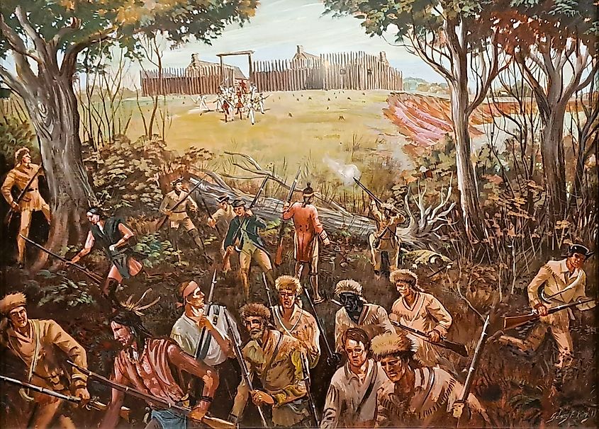 反撃!シドニー・E・キングは、1783年4月17日にカルロス砦3世に関するイギリスの党派襲撃中にルイジアナ州の固定歩兵連隊とクアポーによって作られたサリーを示しています。 Wikicommons経由