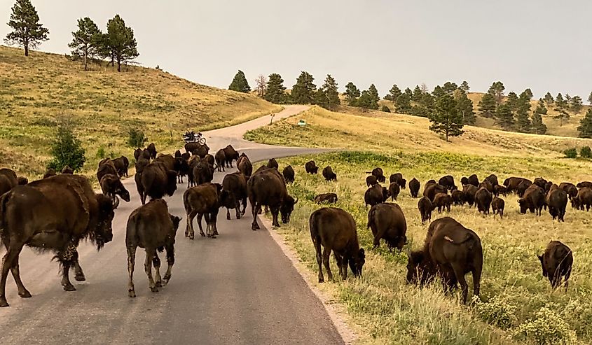 カスター州立公園の道路を渋滞させるバッファローの群れ。
