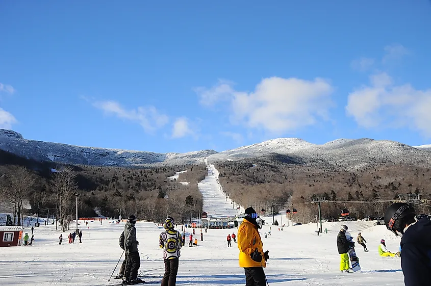 バーモント州ストウのスキー場でスキーを楽しむスキーヤー。