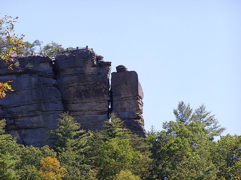 スカイ ブリッジから KY 715 に戻り、さらに南へ進みます。右折してチムニー トップ ロック ロードに入ると、北の展望台に向かって進みます。チムニー トップ ロックの駐車場に到着するまで約 4 マイル進みます。この道はかなり狭く、カーブを曲がりくねって進み、木々の向こうに崖が一瞬覗くことができます。チムニー トップの展望台は、何時間も歩かずに絵のように美しい景色を眺めることができるという理由で、峡谷のファンのお気に入りの 1 つとしてランクされています。