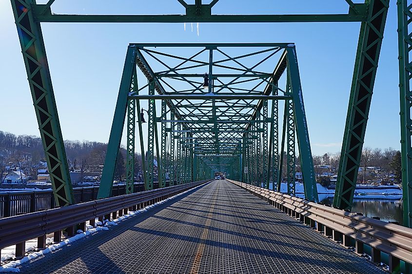 ペンシルベニア州ニューホープとニュージャージー州ランバートビルを結ぶデラウェア川橋の冬景色。編集クレジット: EQRoy / Shutterstock.com