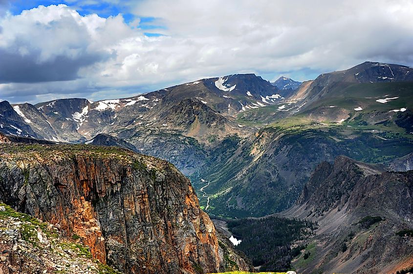ワイオミング州ベアトゥース パスの頂上からの眺め。アブサロカ山の頂上が特徴です。