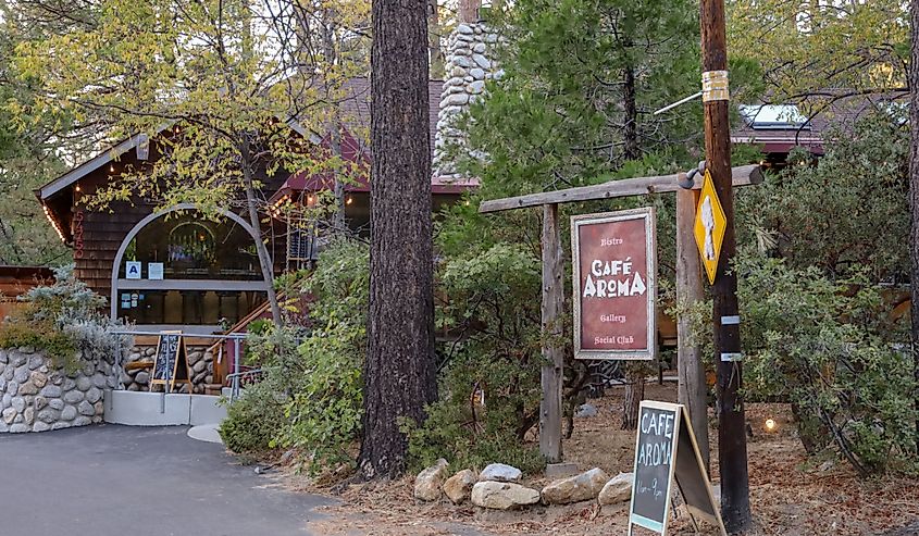 Wooley's や Idyllwild Gift Shop などのショップは、木張りの小屋に Idyllwild ブランドのパーカー、帽子、羊皮の敷物、山のお土産を並べ、ポーチには風鈴、クマの彫刻、手描きの看板が所狭しと並んでいます。ビレッジ レーンにあるボニーズ ブックス & トレジャーズでは、地元の作家による新刊および中古本の棚が自重で傾き、人懐っこい店猫が通路を巡回して閲覧者の注目を集めています。