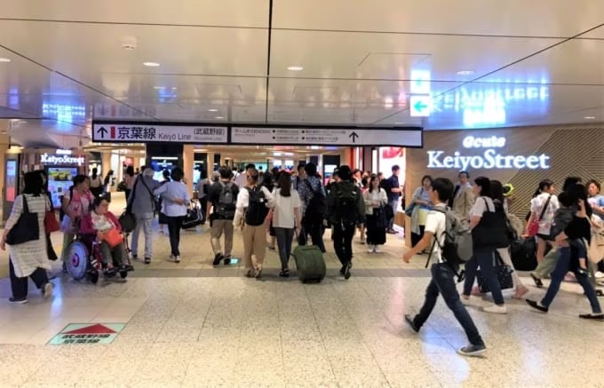 ケヨ線に移動するには、Yaesu South Gateに向かいます。赤いケイヨラインの標識が表示されたら、まっすぐに進みます。エスカレーターと移動通路を下り、底に到達すると、プラットフォームの標識が表示されます。