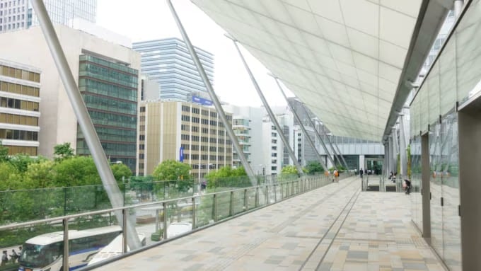 バスターミナルの上にあるYaesu門のすぐ外に、帆船のような屋根と緑の屋外の歩行者デッキが緑が豊富な屋外の歩行者デッキがあります。バスターミナル、周辺のオフィスビル、さらには銀沢の一部の素晴らしい景色を眺めることができます。