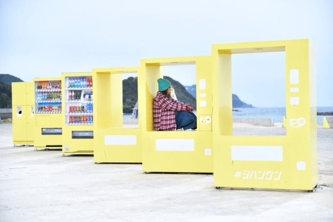 #チハングン は海沿いの駐車場にあるフォトスポットです。 6台の黄色い自動販売機のうち、2台は実際に稼働する機械が隠れています。このインスタレーションを制作したのは、福岡を拠点とするデザイン会社STUDIO MOVE。 #ジハングンに加えて、近くには黄色いブランコもあり、写真を撮るチャンスがたくさんあります。