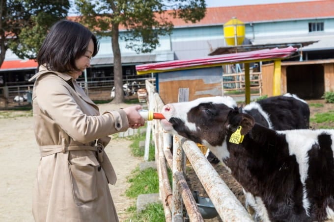 「楽しい・おいしい・自然体験」がテーマの体験型観光スポット「淡路島牧場」。ここでは、哺乳瓶で子牛に餌を与えたり、乳搾りを体験したり、バターを作ることもできます。