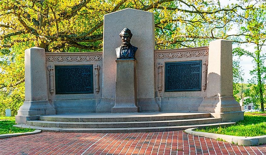 この記念碑は 1912 年に設置され、花崗岩の台座にはめ込まれたリンカーンのブロンズ胸像が特徴です。彼の隣の石にはゲティスバーグ演説の全文が刻まれており、訪問者に演説の不朽のメッセージを思い出させます。リンカーンは戦いを美化するのではなく、犠牲を尊重し、すべての人々は平等に創造されるというアメリカの理想を試すものとして戦争を再構成することを選択した。