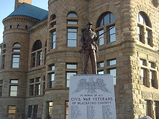 インディアナ州ハートフォード市にあるこの記念碑は、このリストの最新構造です。 2004年に捧げられ、ブラックフォード郡裁判所の芝生の上にあります。ブラックフォード郡内戦の再現クラブは、この記念碑のためにお金を集めました。このクラブは、1993年以来開催されているハートフォード市内戦時代の一環として、インディアナで最大の内戦の再現を定期的に開催しています。