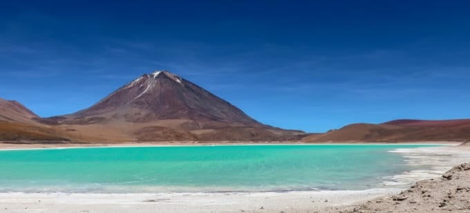 ボリビア南西部のチリ国境近くに位置するラグーナ ベルデは、最もアクセスしやすい場所ではありませんが、多くの観光客を魅了しています。名前は直訳すると「緑の湖」という意味ですが、予想通り湖畔はエメラルド色に輝きます。この神秘的な色は銅を含む堆積物によるもので、風が吹くと輝きが増すと言われています。