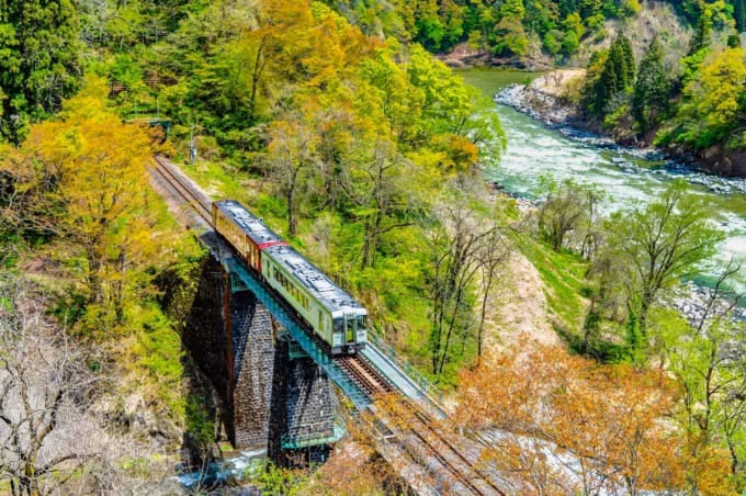 JR飯山線の醍醐味はその景観にあります。鉄道は日本最長の川である千曲川沿いを走り、美しい田園風景を楽しめます。