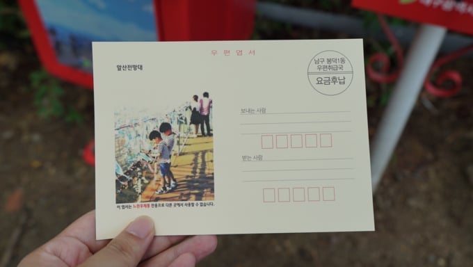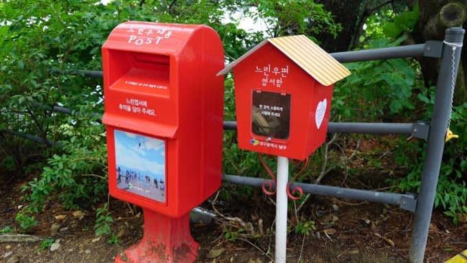 展望台以外にも、周囲にはさまざまなフォトスポットが点在しています。その 1 つが「Slow Post」メールボックスです。中に手紙を入れると1年後に届けられ、アプサン旅行の思い出が甦ります。ポストの横にはポストカードが入った箱があります。未来の自分にポストカードを書いて送ってみてはいかがでしょうか?