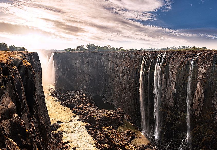 ネイティブのセソト語でモシ・オア・トゥーニャ(「雷を起こす煙」)とも呼ばれるビクトリアの滝は、アフリカ南部のザンビアとジンバブエの国境に沿ったザンベジ川の中ほどに位置する世界最大の滝の 1 つです。ビクトリア滝は世界「最大の」滝であり、「最も高い」滝や「最も広い」滝ではないことに注意してください。この壮大な滝は、世界の 7 つの自然の驚異の 1 つとも考えられています。