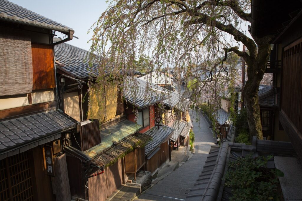京都のギオン芸者地区への旅行は、狭くて石畳の通りと伝統的な木製のマチヤ商人の家のおかげで、時間をさかのぼったように感じさせます。