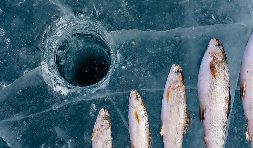 バイカル湖での冬の釣り。きれいで美しい水の中でスズキやグレイリングを捕まえます。地球上で最も深い淡水湖。