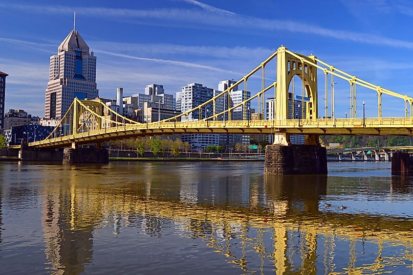 ペンシルベニア州ピッツバーグにある黄色の 6 番街橋が、アレゲニー川の穏やかな水面に映ります。編集クレジット: James Kirkikis / Shutterstock.com