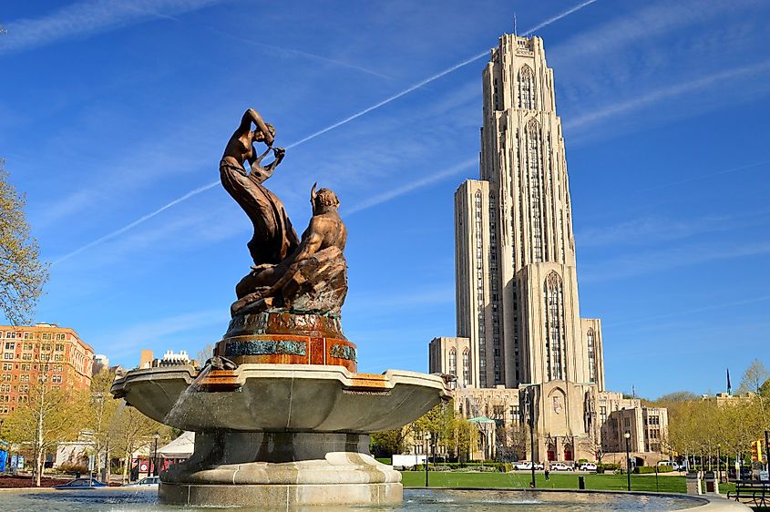学習大聖堂は、国内で最も高い教育建物であり、世界で 2 番目に高い教育建物です。この 42 階建ての超高層ビルは大学の中心として機能し、1 階と 3 階に 31 の国籍ルームがあります。各部屋はピッツバーグに定住したさまざまな民族を表しており、それぞれの文化を反映した記念品で満たされています。街の象徴的な歴史的な坂道、デュケイン インクラインとモノンガヒラ インクラインでは、ワシントン山の頂上までケーブルカーに似た乗り物を利用でき、途中でダウンタウンのスカイラインの素晴らしい景色を眺めることができます。頂上からは、アレゲニー川、モノンガヒラ川、オハイオ川全体と、その前に広がる数多くの地区を見ることができます。