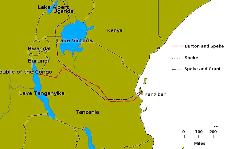 バートン・アンド・スピーク遠征隊とグラント・アンド・スピーク遠征隊が通ったルート。バートンとスピークは東海岸からタンガニーカまで探検し、戻ってきました。スピークは帰路にビクトリア湖へ寄り道した。スピークとグラントは東海岸から旅し、ビクトリア湖を経由してナイル川を遡った(ウィキペディアより)