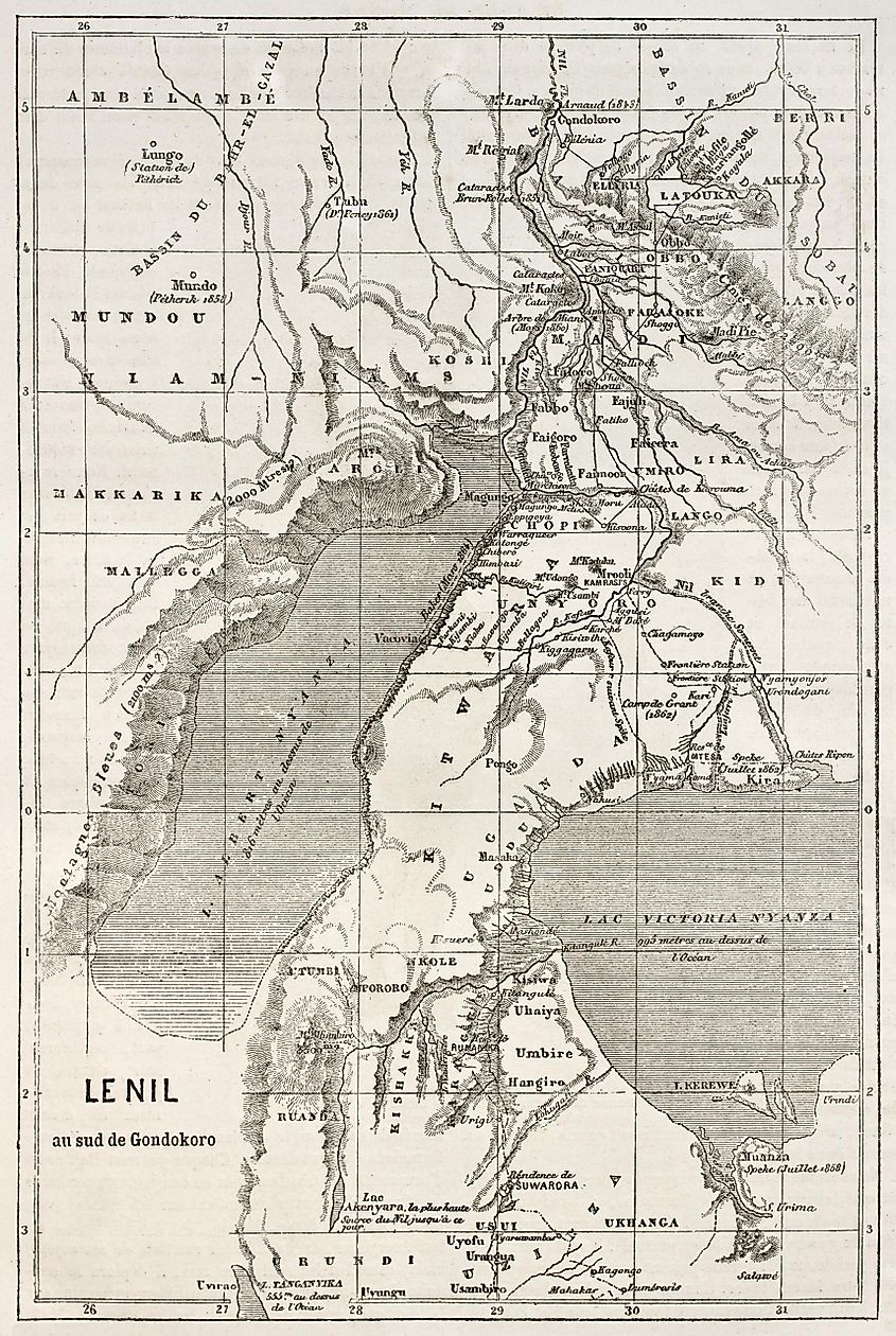 ナイル川源の探索における画期的な進歩は、1858 年に英国の探検家ジョン・ハニング・スピークがアフリカ最大の湖であるビクトリア湖を発見したときに起こりました。リチャード・バートン卿とともに旅行中にスピークは湖の北岸に到着し、流出する川である白ナイル川がナイル川の主な水源であることを確認した。当初は懐疑的で論争もあったが、その後のスピーク、ジェームス・オーガスタス・グラント、サミュエル・ホワイト・ベイカーらによる探検により、白ナイル川の主な水源としてのビクトリア湖の役割が確認された。