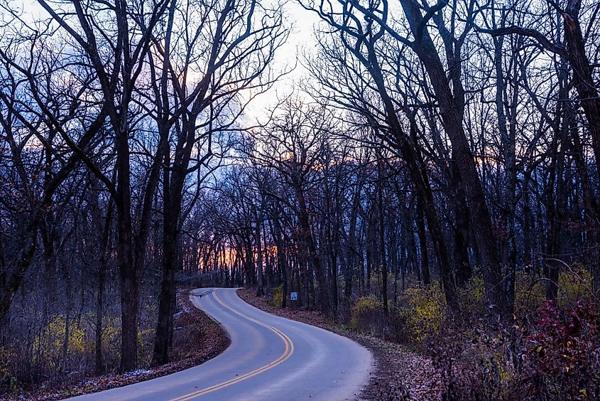 ウィスコンシン州のニューグララスウッズ州立公園を通る曲がりくねった道に沈む穏やかな夕日。