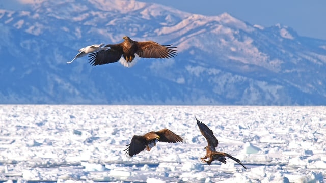 ちなみに知床では冬にもオオワシが見られます。似ていますが、オオワシは印象的な黒い羽を持ち、オジロワシは茶色の羽を持っています。オオワシのくちばしは、より太くて明るい黄色です。違いは相対的なものであるため、初めて観察する人にとっては区別するのが難しい場合があります。不明な点がある場合は、ガイドまたは知識のある人に遠慮なく質問してください。