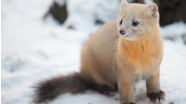 明治時代には北海道全域に生息していましたが、毛皮目的の乱獲により個体数が減少し、現在は狩猟禁止で保護されています。エゾマツテンは主に森林の樹上に生息し、ネズミや昆虫、果実などを主食としています。つぶらな瞳がたまらなくキュートで、時折後ろ足で立ち上がる愛らしいポーズも。