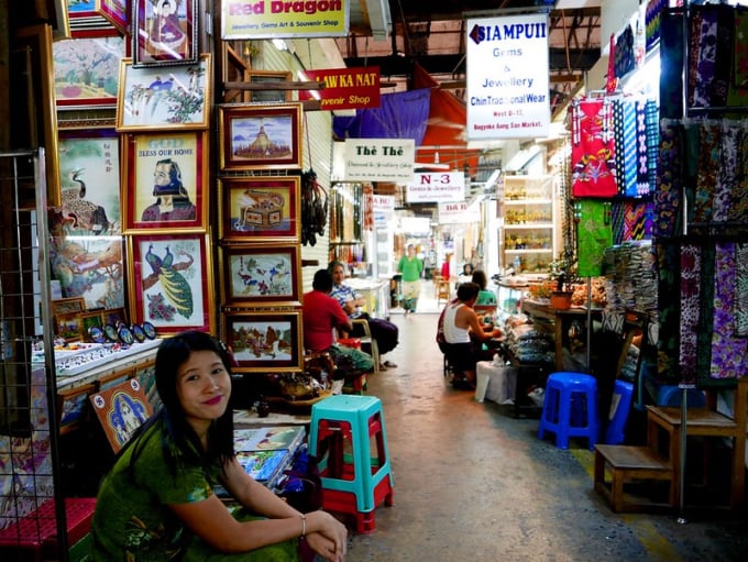 1 階と 2 階は、世界的に有名なビルマ翡翠、ルビー、その他の貴石で作られたアイテムを販売するアンティーク ショップやジュエリー ショップが大半を占めています。市場の残りの部分には、衣料品店、手工芸品店、アートギャラリー、レストランが数多くあります。市場の真向かいにある新しい棟には、食料品、衣料品、医薬品、外国製品を販売する店も入っています。