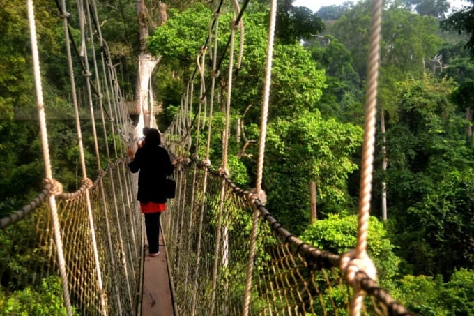 Kakum National Parkの傑出した機能は、高さ30メートル(最高点で最大50メートル)を上昇させ、周囲の熱帯雨林の息をのむような景色を提供する天蓋の通路です。 330メートルの長さの通路は7本の木をつなぎ、訪問者が上から森を体験できるようにします。鳥の愛好家は200種以上の種を見つけることができますが、公園には400種類以上の蝶が住んでいます。運が良ければ、森林象、水牛、オリーブヒヒなどの哺乳類に遭遇する可能性があります。