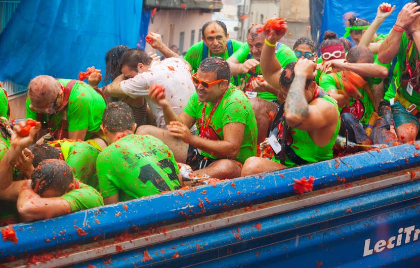 そして、世界最大の食物の戦いの1つ。フィエスタは、毎年8月の最後の水曜日にバレンシアのブニョール(ブニヨルと発音)の町で開催され、何千人もの喜んでいる参加者によって投げられた100トン以上の熟したトマトを巻き込みます